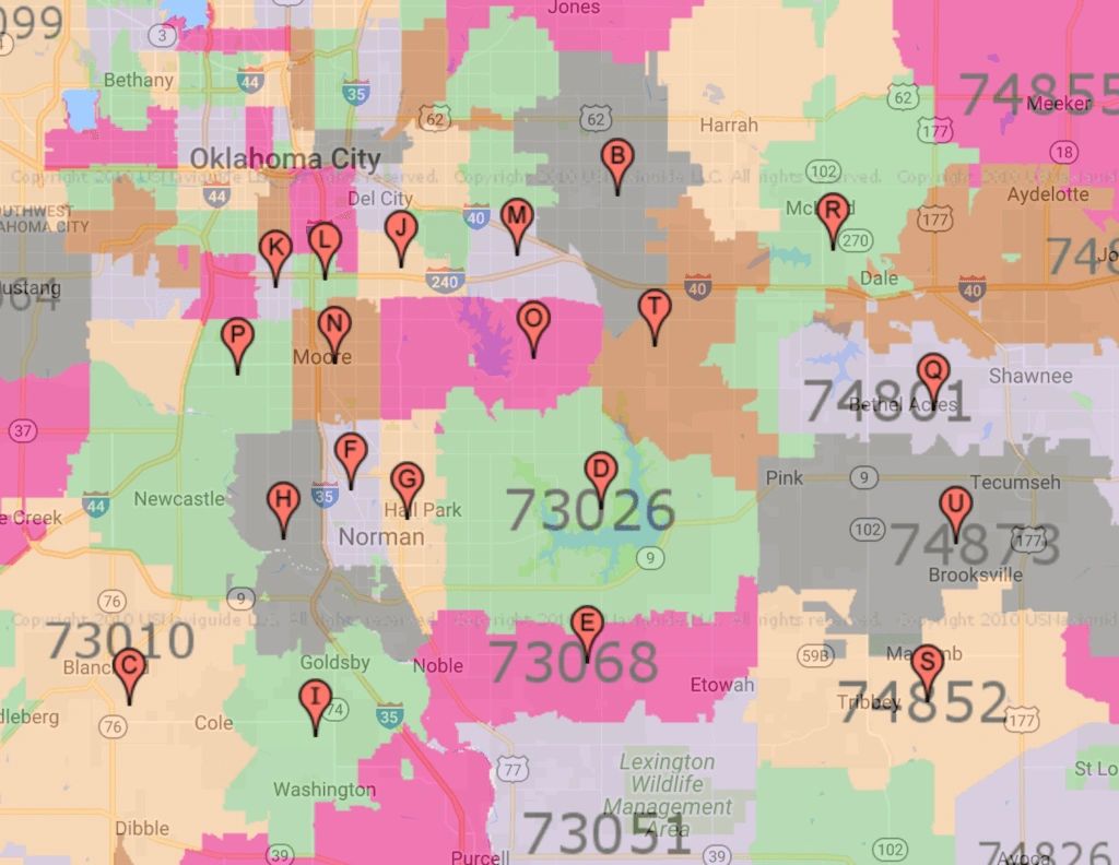 73010, 73020, 73026, 73068, 73069, 73071, 73072, 73093, 73135, 73139, 73149, 73150, 73160, 73165, 73170, 74801, 74851, 74852, 74857, 74873.